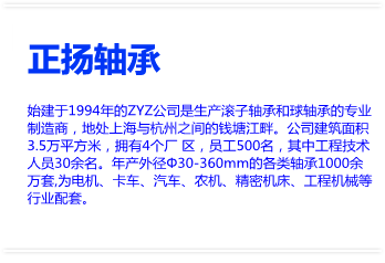 始建于1994年的ZYZ公司是生產滾子軸承和球軸承的專業(yè)制造商,地處上海與杭州之間的錢塘江畔。公司建筑面積3.5萬平方米,擁有4個廠?區(qū),員工500名,其中工程技術人員30余名。年產外徑Φ30-360mm的各類軸承1000余萬套,為電機、卡車、汽車、農機、精密機床、工程機械等行業(yè)配套。